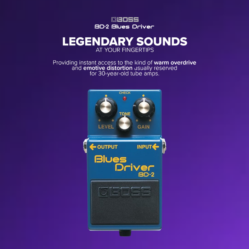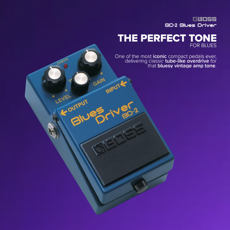 The BD-2 blues driver delivers the creamy yet crunchy sound associated with great blues guitar. This popular pedal provides instant access to the kind of warm overdrive and emotive distortion usually reserved for 30-year-old tube amps.